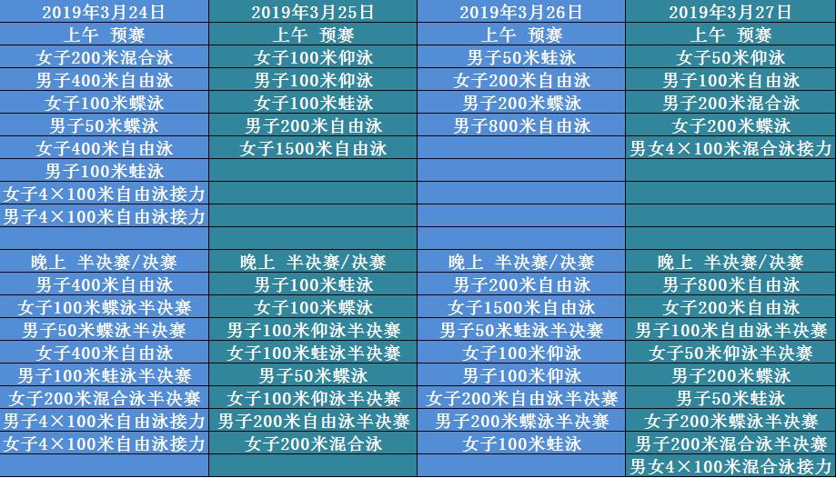 | 6 | 6月19日(五) | 10:00/19:30 | 同左 | 女100蛙/男200蝶/女800自等 | 唐钱婷春锦赛29.44(亚洲纪录) | 唐钱婷国内蛙泳保持不败 | 无 | ★ |